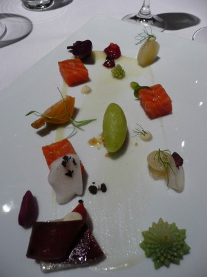 Salade de légumes oubliés, confit de truite d’océan à l’huile d’agrume, sorbet concombre