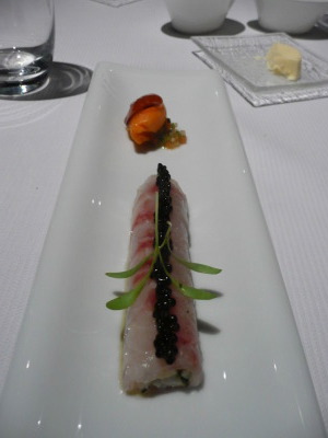 Chair d’araignée de mer roulé en fines lamelles de daurade royale, trait de caviar Osciètre, sorbet gaspacho