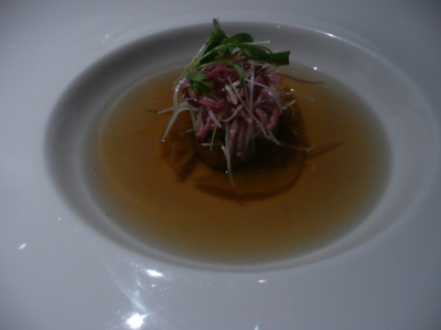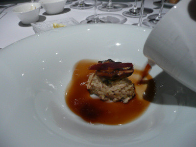 Compoté d’épeautre à l’effilochée de lièvre, cèpes grillés, consommé de truffes.