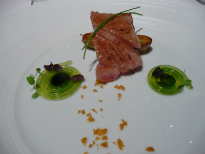 Ventrèche de thon » Toro » sur une tartine de pommes rattes à l’aubergine, vinaigrette au basilic fumé.