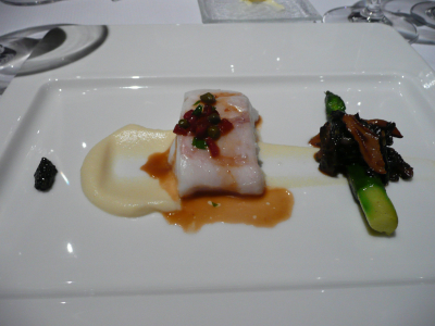 Filet de » Goby » cuit en croûte de sel à la truffe, purée de céleris, fricassée de champignons sauvages, jus aux câpres.