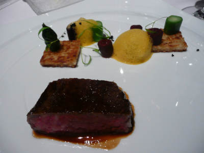 Pièce de boeuf » Wagyu » rôtie au four, galette de risotto, confit de carottes violettes caramélisées, émulsion aux noisettes.