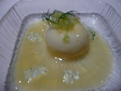 Île flottante à l’ananas, salade de fenouil, gelée à la mélisse.