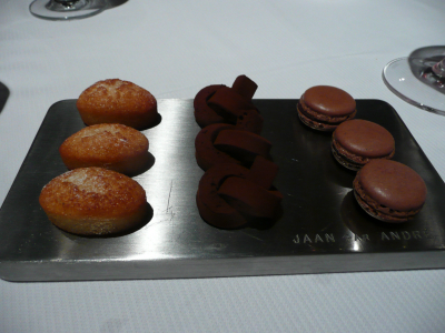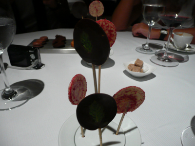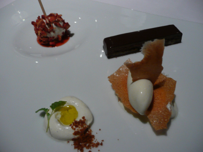 Palet de chocolat » Ngyonbo », chantilly/huile d’olive, fromage blanc aux fraises séchées.