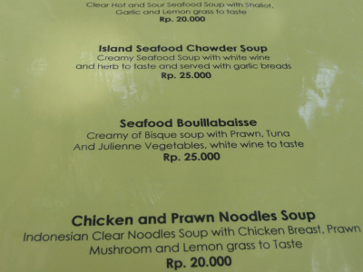 La carte est essentiellement poisson, on y propose même une bouillabaisse. Il faut y déguster aussi le plat local le » Nasi Goren » ou le » Bakmi Goren « , préparations à base de riz poêlé, accompagné de viande, de crustacès, calamars, légumes, poulet….. on y mélange un peu tout dedans…. mais c’est bon.