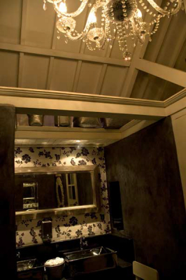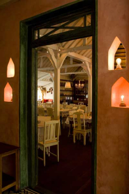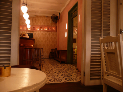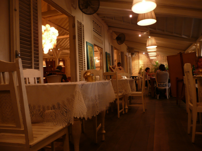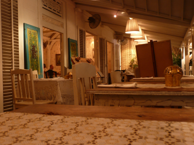Toute en bois la bâtisse a été joliment décorée avec beaucoup de goût et de simplicité. le lieu est reposant, romantique, c’est plaisant on s’y sent un peu chez soi. Carreaux de ciment au sol, bassin ouvert au fond du restaurant, plancher en bois sur la terrasse, ampoules nues dans des niches dans les murs, pleins d’idées simples qui rassurent.