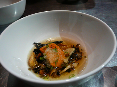 Son plat, gelée de patates douces, bouillon de champignon, et citron caviar