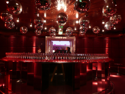 Le bar rond à l’entrée, est armé en coupe de Champagne….. les vins de Limoux partenaires de la soirée vont couler à flots ce soir !