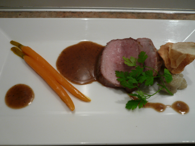 Noix de veau rôtie, topinambours et carottes glacées, jus aux truffes