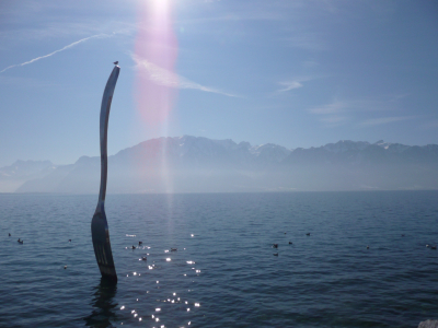 Le long de l’eau quelques passants se ballade en admirant les diverses œuvres qui y sont disposés. Comme une fourchette monumentale plantée dans l’eau ou une statue de bronze de Charlie Chaplin. Les montagnes environnantes sont toutes blanches, elles se reflètent dans l’eau du Lac ce qui crée une vision très lunaire du site.