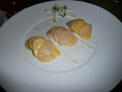 » Pièce de saint-Jacques, fleur de sel et rêve de Cochin » selon Olivier Roellinger, accompagné d’un Chardonnay de Limoux 2001 » Clocher de Saint-Couat «