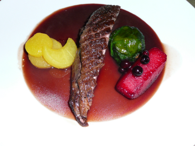 Canette de Challans cuit en cocotte en aiguillette, baies de cassis, selon Michel Troisgros accompagné d’un Merlot-Grenache » Les hauts Clochers »