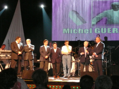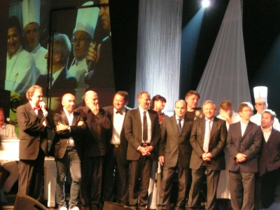 Tous les chefs et Grands sommeliers sur scène. De gauche à droite, Philippe Faure-brac, Jacques Pourcel, Michel trama, Christian Le Squer, Olivier Poussier, Georges Blanc, Michel Troisgros, Michel Guérard…..