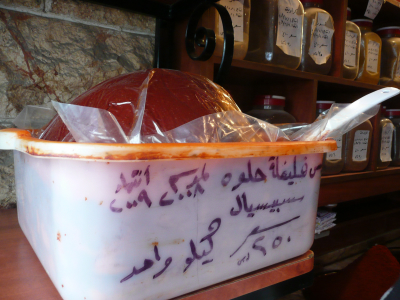 J’ai découvert chez ce marchand la mélasse de grenade, un sirop de grenade réduit et fermenté je pense car très acide, ça ressemble à un caramel de vinaigre balsamique, c’est sirupeux et plein de parfum.