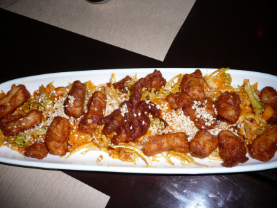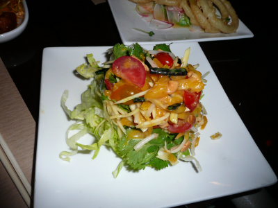 Dès l’entrée le ton est donné, c’est la Thaïlande à NY, le restaurant est super grand, au moins 300 places assises, la cuisine est ouverte sur une des salle. La salle principale s’organise autour d’un patio qui donne en sous sol sur une autre salle de restaurant. L’ensemble de la décoration est en boiseries sculptées esprit Asie, l’atmosphère y est très dépaysante, on se sent très bien dans les sièges en cuir blanc, le service est efficace et attentif.