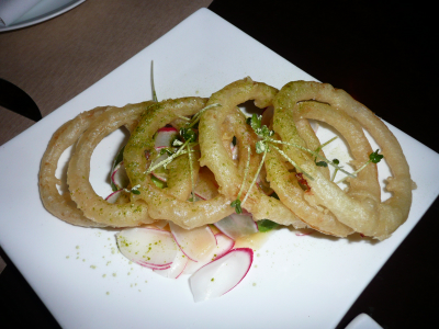 Salade d’avocat avec une sauce Wasabi et des oignons tempura