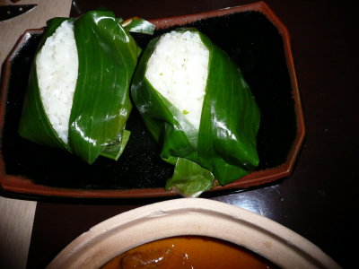 Canard confit au curry Rouge, servi avec un riz au lait de coco en feuilles de bananes…