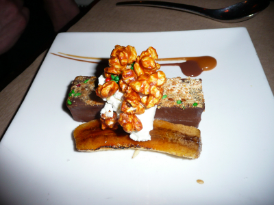 Bananes caramélisée et chocolat/caramel épicé. Pop Corn caramélisé.