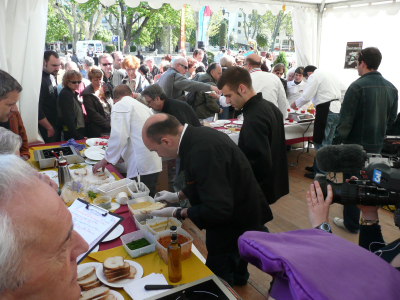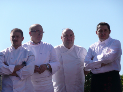 5 chefs y ont participés : Jérome Nutile (Hostellerie du Castellas à Collias), Jean-Pierre Cazal ( Le Spinaker, à Port Camargue), Serge Chenet (Entre vigne et Garrigue, à Pujaut) et Henri Gouny (L’Atelier des Sens, à Ales) à qui a été confié l’espace restauration Militant du Goût, sans oublier le Jardin des Sens représenté par un jeune chef et moi même.
