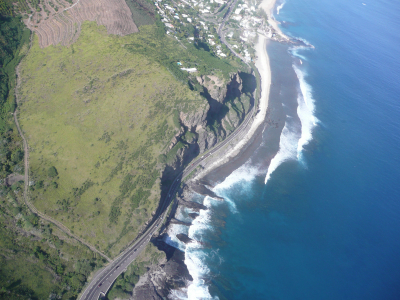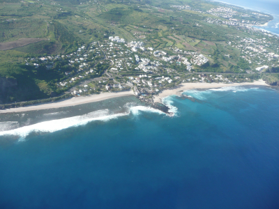 La côte est très découpée, l’océan bleu azur souvent alternée de couleur plus claire définie par la barrière de corail. La terre se termine souvent en falaises qui tombent à pic dans l’océan, ce qui fait que l’île de La réunion n’a pas beaucoup de plages de sables fin et blanc comme sur l’île Maurice toute proche. L’océan est souvent agité et les vents puissants, ce qui fait le bonheur des surfeurs, seules quelques plages sont reposantes.