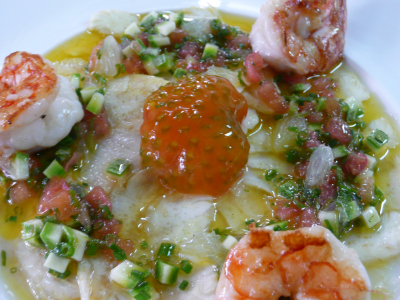 Carpaccio d’artichauts, vinaigrette aux citrons verts et courgettes, queue de gambas.