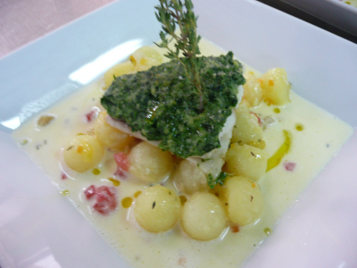 Filet de daurade en croûte de blettes, pommes de terre au bouillon.