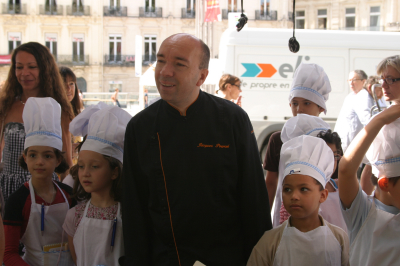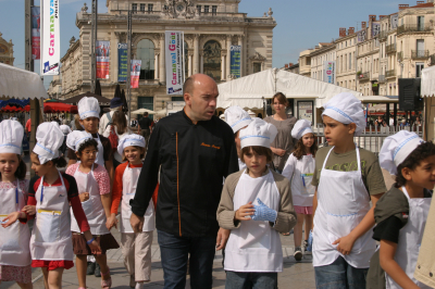 Animation principale du Carnaval du Goût, les cours de cuisines dispensés par les six chefs se deroulèrent sur les stands mis en place sur la Place de La Comédie à Montpellier. La Place de la Comédie, une des places de ville les plus fréquentées de France, située en plein coeur de la ville, elle est le lien entre la vieille et la nouvelle ville qui s’est étendue vers le sud.