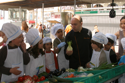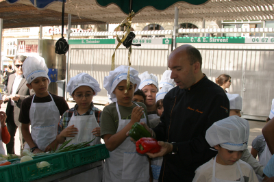 La matinée débuta avec un jus de fruit frais réalisé par chacun des chefs, que purent déguster tous les enfants. Après ces verres de vitamines, chaque groupe accompagné par le chef responsable se dirigea vers le commerçant de légumes pour y faire sont marché.