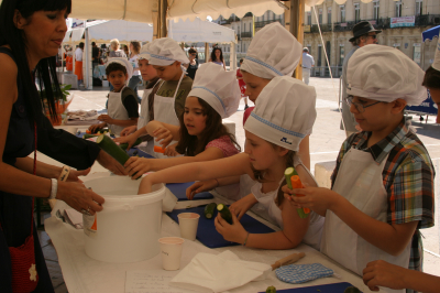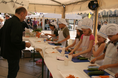 C’est donc sur des stands aménagés que chacun des chefs réalisa deux recettes avec une vingtaine d’enfants, une recette salée à base de légumes de la région, et une recettes de dessert sucrée à base de fruits frais.
