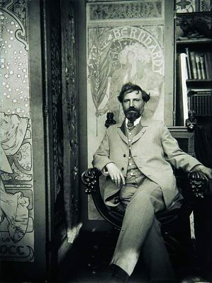 Il commence sa carrière par la réalisation de travaux décoratifs comme les décors de théâtre à Vienne en 1879. En 1887 il rejoins Paris où il produit un magazine de Théâtre et réalise des affiches publicitaires. En 1894 il réalise la première affiche pour un pièce de Sarah Bernhard au Théâtre de la Renaissance.