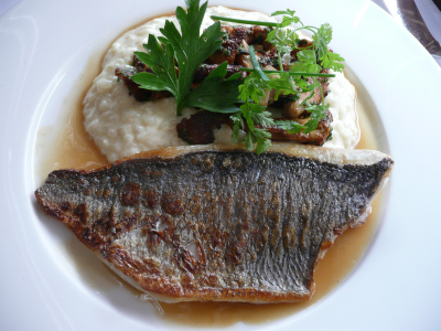 Daurade rôtie, risotto au Parmesan et poêlée de girolles.