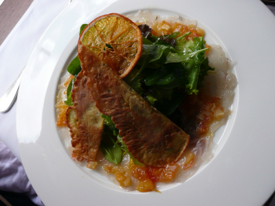 Carpaccio de loup, Soca et vinaigrette d’agrumes, toujours au Tiffany sur la carte d’été….