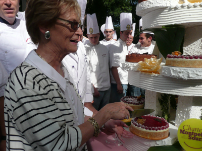 Hélène Mandroux découpant les premières parts du grand Gâteau d’anniversaire.