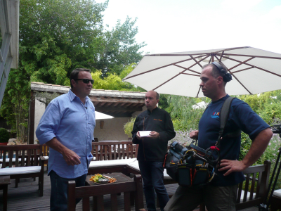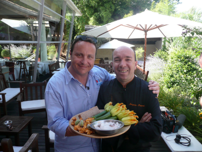 Puis l’après midi ce fut France télévision pour son émission de France2 « Autour du Tour « et son animateur Vincent Ferniot qui tournèrent autour d’un scénario digne du cinéma une recette originale réalisée par le chef Jacques Pourcel une « Salade de courgettes en fleurs et girolles, coulis de fleurs, calamars grillés et lard de Colonnata « . Reportage diffusé le lendemain avant le départ de l’étape reliant Le Cap D’Agde à Perpignan. Voir le lien ci-dessous.