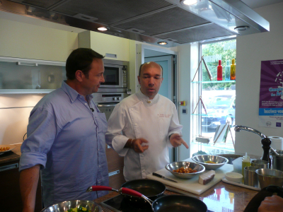 Laurent Pourcel à l’atelier de cuisine pour la démonstration du plat.