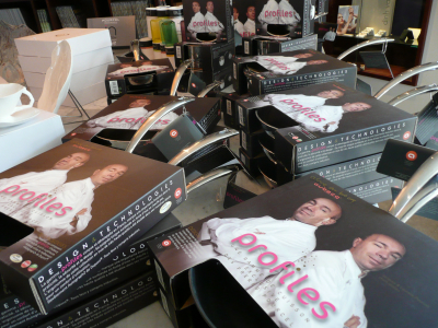 Deuxième collections qui a pris ces quartiers à la boutique du Jardin des Sens la gamme » Profile « de la marque Aubecq qui produit du matériel de cuisson de haute technologie. La gamme » profile » a été crée avec l’assistance des chef Jacques & Laurent Pourcel, ( voir article du 19 juillet 2009 ).