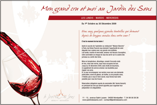 Le Jardin des Sens à Montpellier, lance à partir du 1 er octobre et jusqu’au 30 décembre 2009 une belle opportunité pour tous les collectionneurs de grandes bouteilles, dont certains possèdent des Milléssimes d’exception dans leur cave.