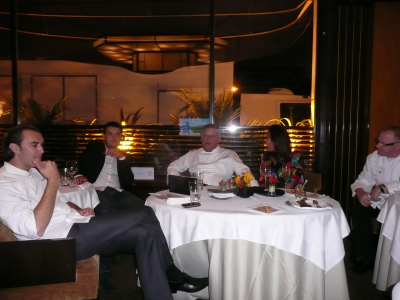 Entre deux séquences de tournage, séance repos pour Cyril Lignac au premier plan, Jean-François Piège, Georges Blanc et son épouse Sally et Marc Meurin