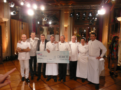 À la fin de l’émission, les deux finalistes Grégory ( le gagnant ) et Flore entouré par les chef et Stéphane Rotenberg animateur de l’émission. Et le Chèque de 10 000 euros remporté par le vainqueur !