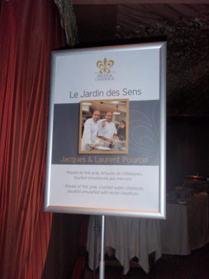 Les équipes Pourcel étaient présentes avec à leur tête leurs Christophe Lerouy et Benjamin Amrstrong accompagné de Laure De Carrière déléguée aux Relais & Châteaux pour le Groupe Pourcel et Yannis kéhrachi sommelier du Jardin des Sens. Ils ont donc présentés un plat » La Royale de foie gras de canards et Bouillon émulsionné aux châtaignes « .