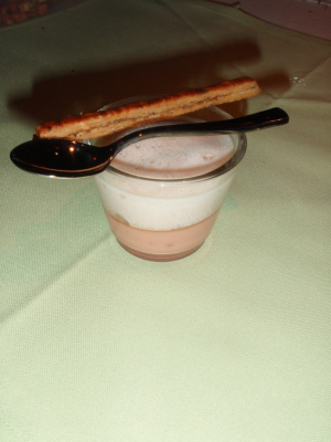Ganache et crème montée chocolat «Jivara», glace caramel salé, sauce banane épicée