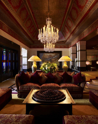 Ocre, pourpre, or, chocolat sont quelques unes des couleurs privilégiées par Jacques Garcia : hé bien vous n’y échapperez pas ! La Mamounia version 2009 est dans la lignée de la patte du maître du baroque chic. Un style arabo/andalou et le métissage de la tradition artisanale marocaine et du contemporain, donnent un esprit au lieu. On se sent bien aussitôt passée la grande porte d’entrée. Chics et abordables, chaleureux et confortables les espaces se déclinent avec une belle unité, un esprit de grande maison bourgeoise plane.