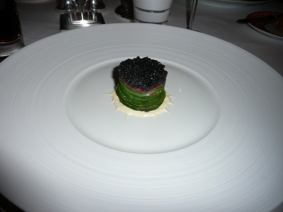 Pressé d’épinard, carpaccio de boeuf et caviar.