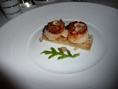 Noix de Saint-Jacques sur une écrasée de pommes de terre aux noisettes.