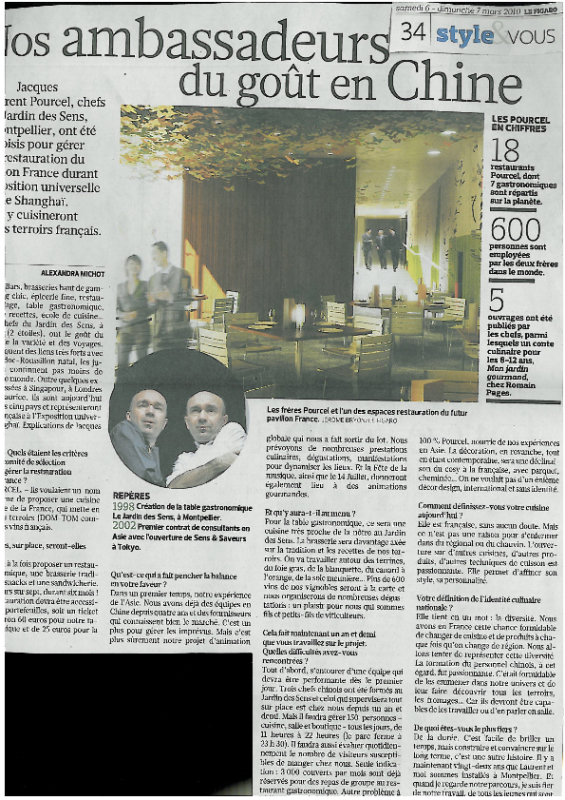 » À l’Exposition Universelle de Shanghai, les frères Pourcel seront les chefs du pavillon France « , c’était le titre que l’on pouvait lire ce samedi 6 et dimanche 7 mars sur le quotidien Le Figaro dans le cahier » Le Figaro Style & Vous « , en page 34.