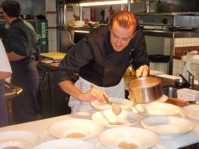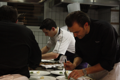 Cyril Lignac n’a pas hésité à mettre le tablier et à se mettre en cuisine avec les équipes du Jardin des Sens pour élaborer puis servir le dîner de 120 personnes qui s’étaient pressées au restaurant pour cette unique soirée avec trois Grands Chefs derrière les fourneaux.
