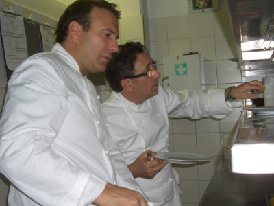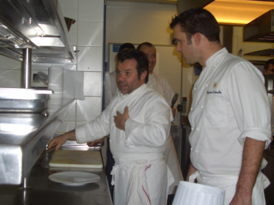 Ci-dessus les chefs Jean-François Rouquette et Patrick Jeffroy, et ci-dessous le chef Michel Troisgros pendant le service du dîner.