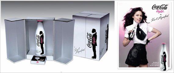 Coca-Cola fait appel en 2010 au génie créatif de Karl Lagerfeld pour habiller et sublimer la bouteille. Le créateur a imaginé un nouveau code couleur pour cette petite bouteille aluminium, devenue à la mode grâce à de nombreux créateurs. Profil noir sur fond blanc, capsule rose et dégradé gris, la bouteille Coca-Cola light révèle, telle une ombre chinoise, la silhouette iconique du grand designer. Le soir venu, cette bouteille revêt son habit de nuit et devient luminescente. La bouteille Coca-Cola light by Karl Lagerfeld sera disponible à partir du 28 avril chez Monoprix, Carrefour, Franprix, entre 1 € et 1,50 € ainsi que dans des points de vente sélectifs, type Bert’s, Lafayette Gourmet, La grande Epicerie du Bon Marché, le Drugstore.