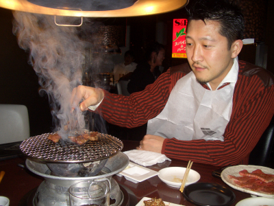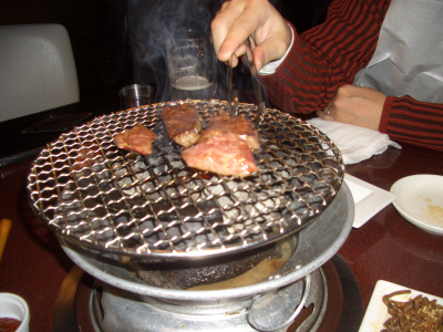 Cuisine coréenne, avec le boeuf sur le barbecue au centre de la table.