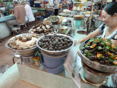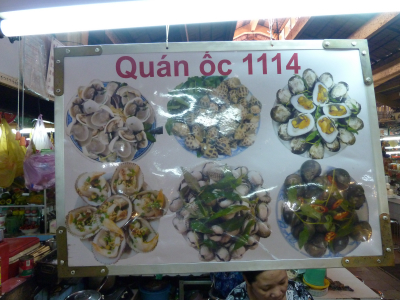 Pour manger sur le marché les meilleurs coquillages préparés minute, c’est Quan Oc 1114. Fraîcheur assurée et bonne cuisine. Testé par Alain Caron lui-même !